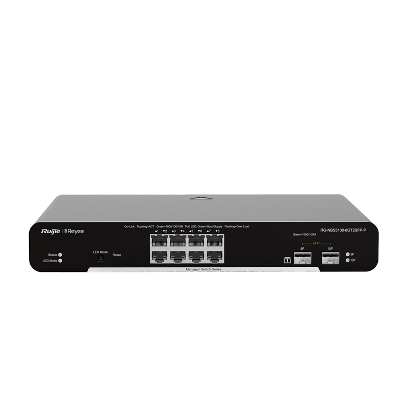 Reyee Switch PoE Cloud Layer 2, 8 porte PoE+ Gigabit+ 2 SFP Gigabit, 30W per porta 802.3af/at / Massimo 125W. Static LAG/DHCP Snooping/IGMP Snooping/Port Mirroring. VLAN/Port Isolation/STP/RSTP/ACL/QoS. Gestione Cloud. Alimentazione: AC 100 V – 240 V. Fino a 30 W per ogni porta (125W per l’intero dispositivo). Caratteristiche PoE: A norma IEEE 802.3at PoE+ / IEEE 802.3af PoE. Dimensioni: 220 (P) x 43.6 (H) x 330 (L) mm.