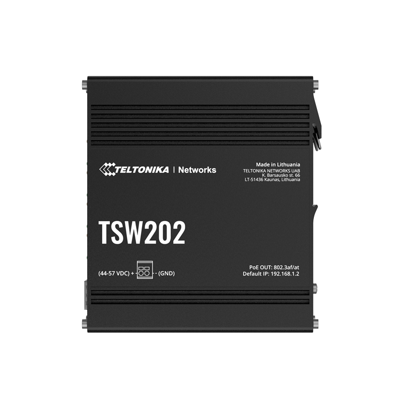 Switch PoE Managed Industriale Teltonika, 8 porte Ethernet RJ45 Gigabit +2 SFP Gigabit, 8 Porte Ethernet PoE+ 802.3af/at. Fino a 30W per ogni Porta PoE. Fino a 240W di Potenza PoE. Robusto Alloggiamento in Alluminio. Alimentazione: Connettore DC 2 Pin industriali 7~57VDC che non alimentano dispositivi PoE e 44~57VDC che alimentano dispositivi PoE (Alimentatore non incluso). Consumo massimo 8W / 248W con PoE. Dimensioni: 44,2 (H) x 132 (L) × 122,2 (P) mm.
