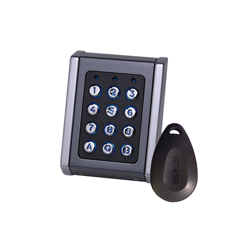 tastiera in alluminio a 1000 codici stand alone metalizzata piu’ prossimita’.1000 Schede/Codici PIN, uscita: a 2 relè (R1: 10A/24 VDC/ 120 VAC; R2: 2A/24 VDC/ 120 VAC); a 10 relè se usato con scheda RB0408. Prossimità EM 4002/4100 e HID (125kHz). Alimentazione 12/24 VAC/DC; max. 150 mA. Montaggio da interno e da esterno. Tamper di protezione per anti manomissione. Tasti metallici e policarbonato (PVC) retroilluminati. Buzzer sonoro. 3 led colorati di funzionamento.Collegamento in RS485. Grado di protezione IP65. Colore: Grigio/Cromato. Dimensioni: 120x90x44mm.