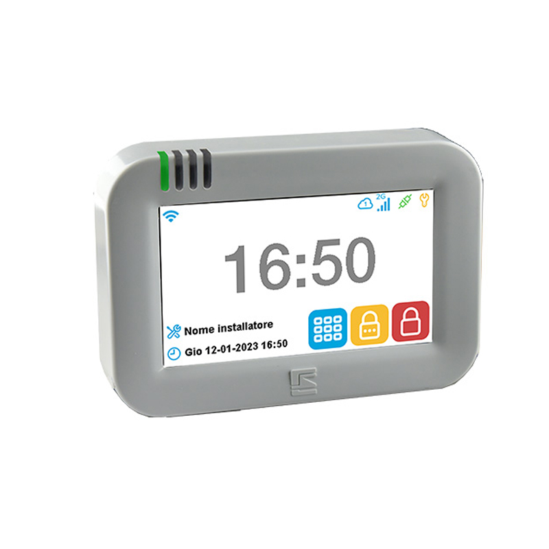 Elegante terminale touchscreen 4,3″ TFT 16,7 milioni di colori con lettore chiavi di prossimità integrato. Formato widescreen 16:9, microSD card reader. Altoparlante integrato. Cover intercambiabile removibile dall’utente per l’accesso alla microSD card. Leds di segnalazione stato. Dimensioni 133 x 92 x 25 mm. (cod.CSI003216).
