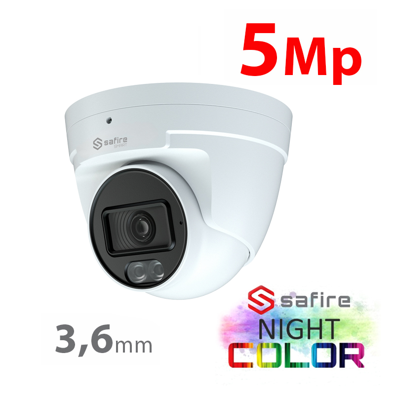 Telecamera Turret SAFIRE SMART 4 in 1, gamma B1 Night Color, 5 Mp ( (2560×1936) , 1/2.5″ CMOS. Ottica 3.6mm. Illuminazione LED bianca 30 m, DWDR, HLC, BLC, AGC. Waterproof IP67. Microfono incorporato, audio su cavo coassiale. Alimentazione: DC 12 V / 250 mA, 3W max. Dimensioni: 82.8 (H) x 94.6 (Ø) mm. Corpo in metallo e supporto in plastica. Compatibile con: SF-WALLBRACKET-0203 staffa da parete; SF-JBOX-0106, SF-JBOX-0302 junction box.