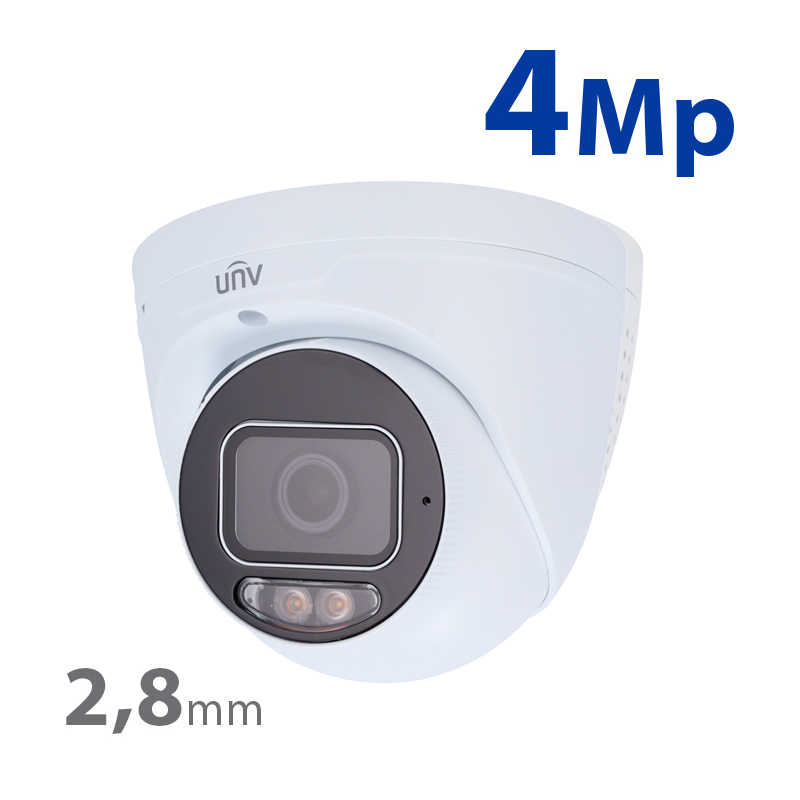 Telecamera turret IP da 4 Mp, Gamma Prime, CMOS a scansione progressiva da 1/1,8″. Obiettivo da 2,8 mm | ColorHunter, immagini a colori 24 ore su 24, 7 giorni su 7, SIP, prevenzione intelligente delle intrusioni, riconoscimento facciale. Alimentazione: CC 12 V/7,5 W, PoE IEEE802.3af. Dimensioni: 110.5 (Ø) x 94.1 (H) mm.