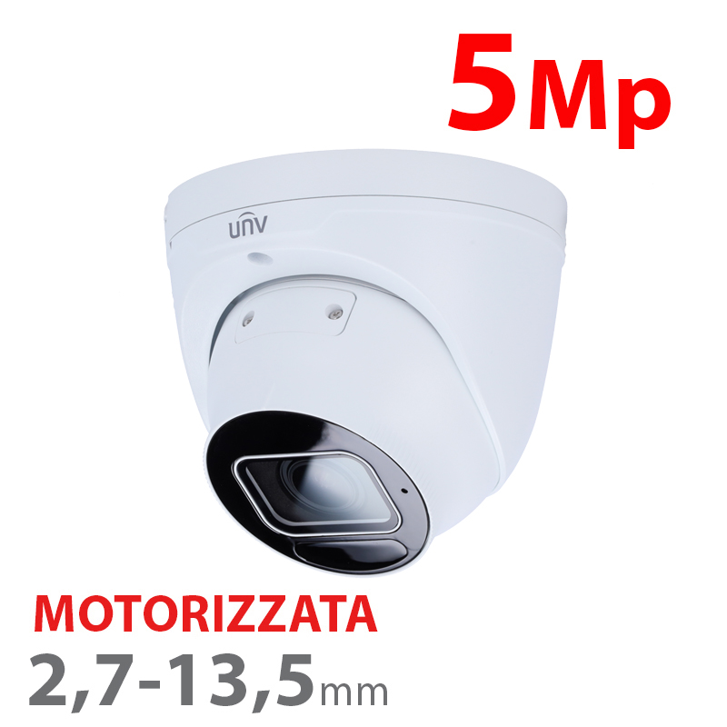 Telecamera IP 5 Mp Gamma Prime, 1/2.7″ Progressive Scan CMOS. Lente motorizzata 2.7-13.5 mm AF. IR LED Portata 40 m. Interface WEB, CMS, Smartphone e NVR. Alimentazione: DC 12 V / 7 W, PoE IEEE802.3af. Dimensioni: 110 mm (P) x 129 (Ø) mm. Compatibile con: CBOX-NX7-7777, UV-TR-JB03-H-IN, CBOX-NX1-1118, CBOX-B52PROS junction box; UV-TR-UP06-IN staffa da palo; UV-TR-JB07/WM03-F-IN, UV-TR-WM03-B-IN staffa a parete; UV-TR-SE24-A-IN, UV-TR-CM24-IN, UV-TR-SE24-IN staffa a tetto.