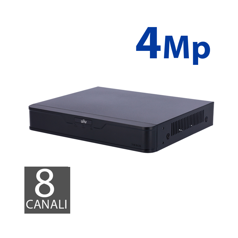 Videoregistratore 5n1 Uniview, 8 CH HDTVI / HDCVI / AHD / CVBS + 4 extra IP. Audio. Ammette 1 hard disk. Alimentazione: DC 12 V / 8 W. Dimensioni / Peso: 46 (H) x 260 (L) x 243 (P) mm / 1 kg.