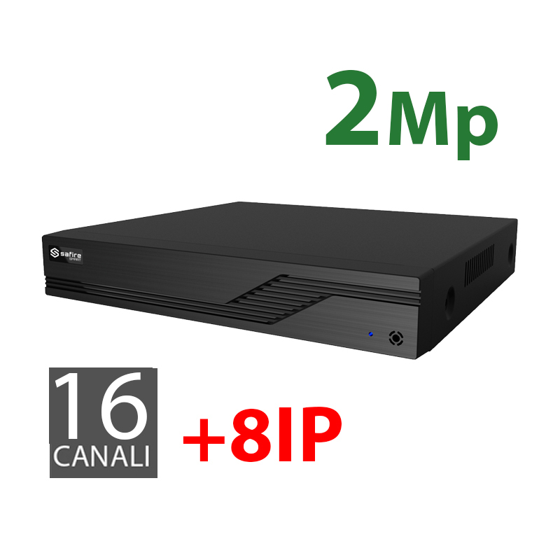 Videoregistratore analogico XVR SAFIRE SMART, Serie 6, 16CH HDTVI/HDCVI/HDCVI/AHD/CVBS/CVBS/ 16+8 IP. Uscita HDMI Full HD e VGA / 1 HD. Risoluzione massima di registrazione 1920×1080. Ingressi BNC compatibili con TVI/ AHD/CVI: 5MP/4MP/1080p Lite/720P/WD15Mp Lite (10FPS). Audio: 1 IN/ 1 OUT. Alimentazione: DC 12 V / 2 A (Consumo senza HDD < 8 W). Dimensioni: 42 (La) x 255 (Lu) x 222 (Al) mm / 1.2 Kg.