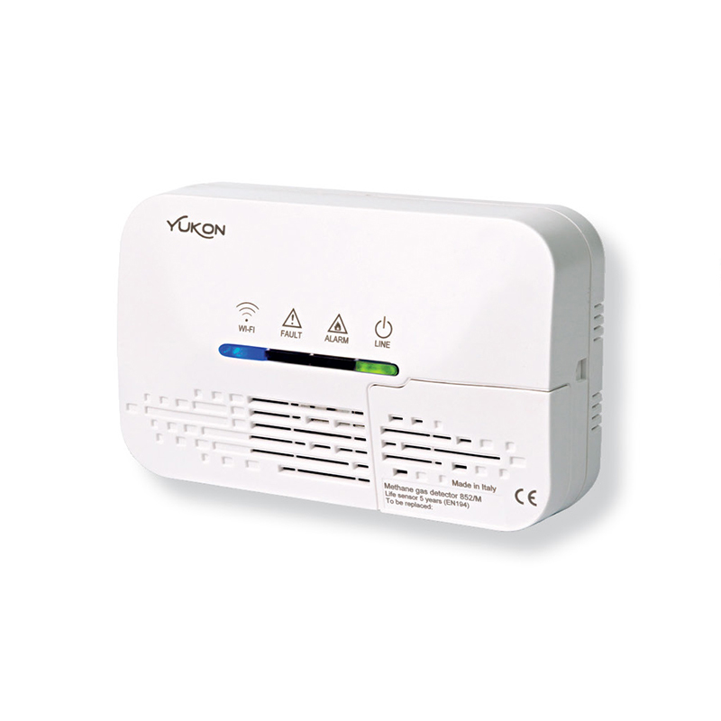 Il rivelatore gas Yukon Metano è una centralina da parete che rileva ed avvisa una possibile perdita di Gas Metano all’interno dell’abitazione. Alimentazione: 100/230Vca – 50/60 Hz e 12Vcc. Soglia di allarme: 10% LIE – Campo di misura: 0/20% LIE. Sensore: Catalitico. Allarme: ottico (led rosso), acustico (buzzer interno 85dBA a 1m), notifiche su smartphone. Relè: 10A @ 250Vca – 10A @ 30Vcc, SPDT. Protocollo Wireless: IEEE 802.11 b/g/n, frequenza: 2,4-2,4835 GHz. Conformità alla norma: EN 50194-1:2010.